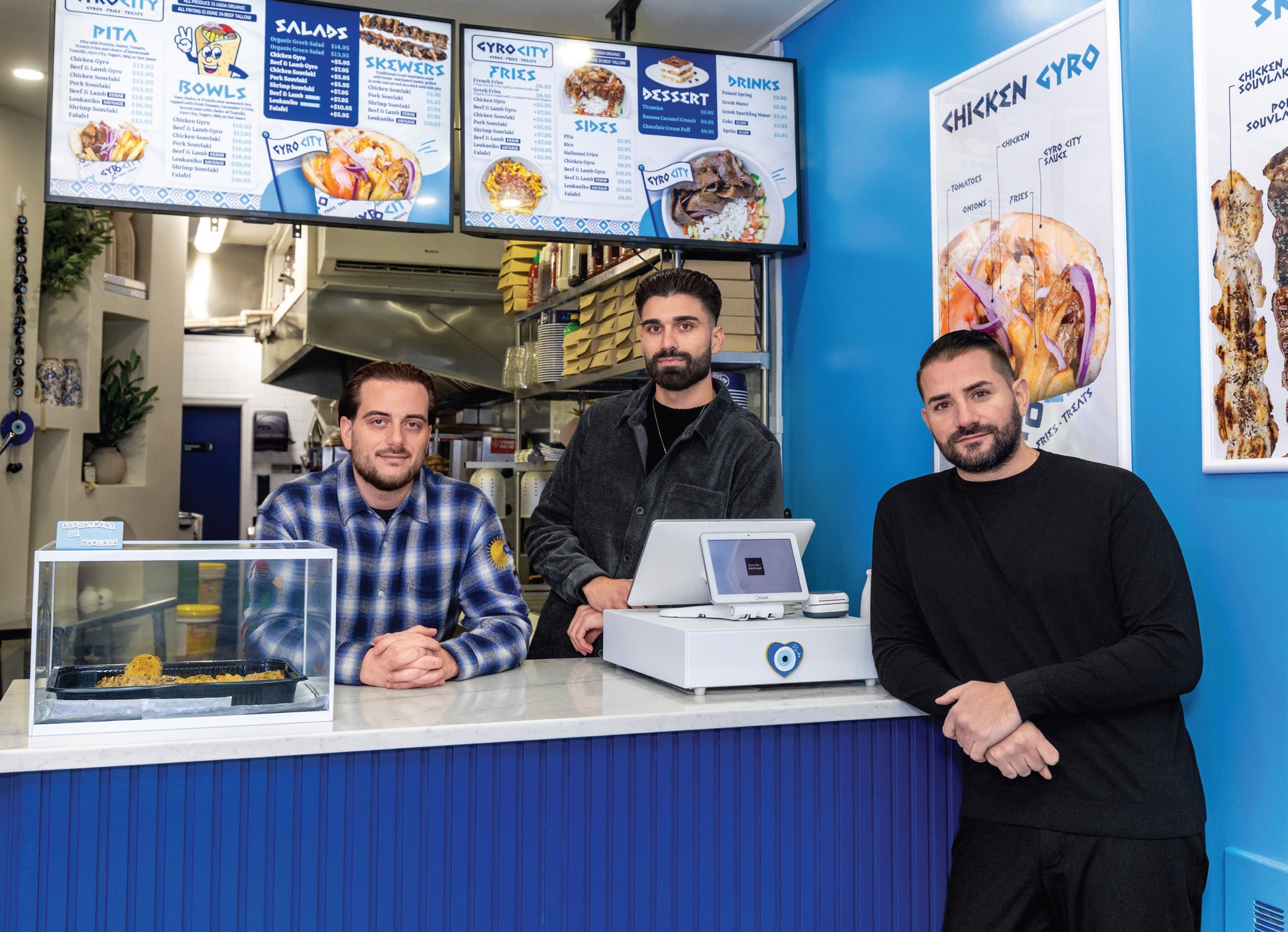 For Karavias, who started promoting restaurants and nightlife at age 16, the connection with his Greek heritage is as crucial to Gyro City’s mission as the food. The McDougal location “is a warm space” with nods to Greece, says Karavias. “It’s got blues and whites. We’re Greek Orthodox. We have our Εικόνες (icons) and our Greek Orthodox Bible. This is something personal for us, an important project. Angelo and I are proud Greeks, very connected to the Greek community, and we want to showcase to New York City how great Greek food can be.”