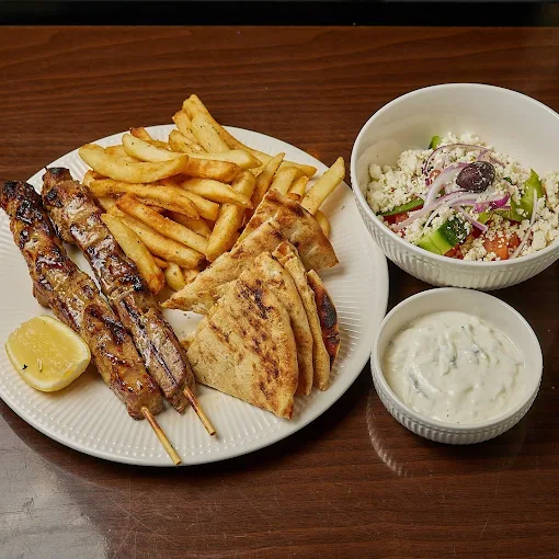 Το μενού περιλαμβάνει αγαπημένα ελληνικά πιάτα όπως γύρο, σουβλάκι, παστίτσιο και φρέσκες σαλάτες, όλα φτιαγμένα με αγνά υλικά.