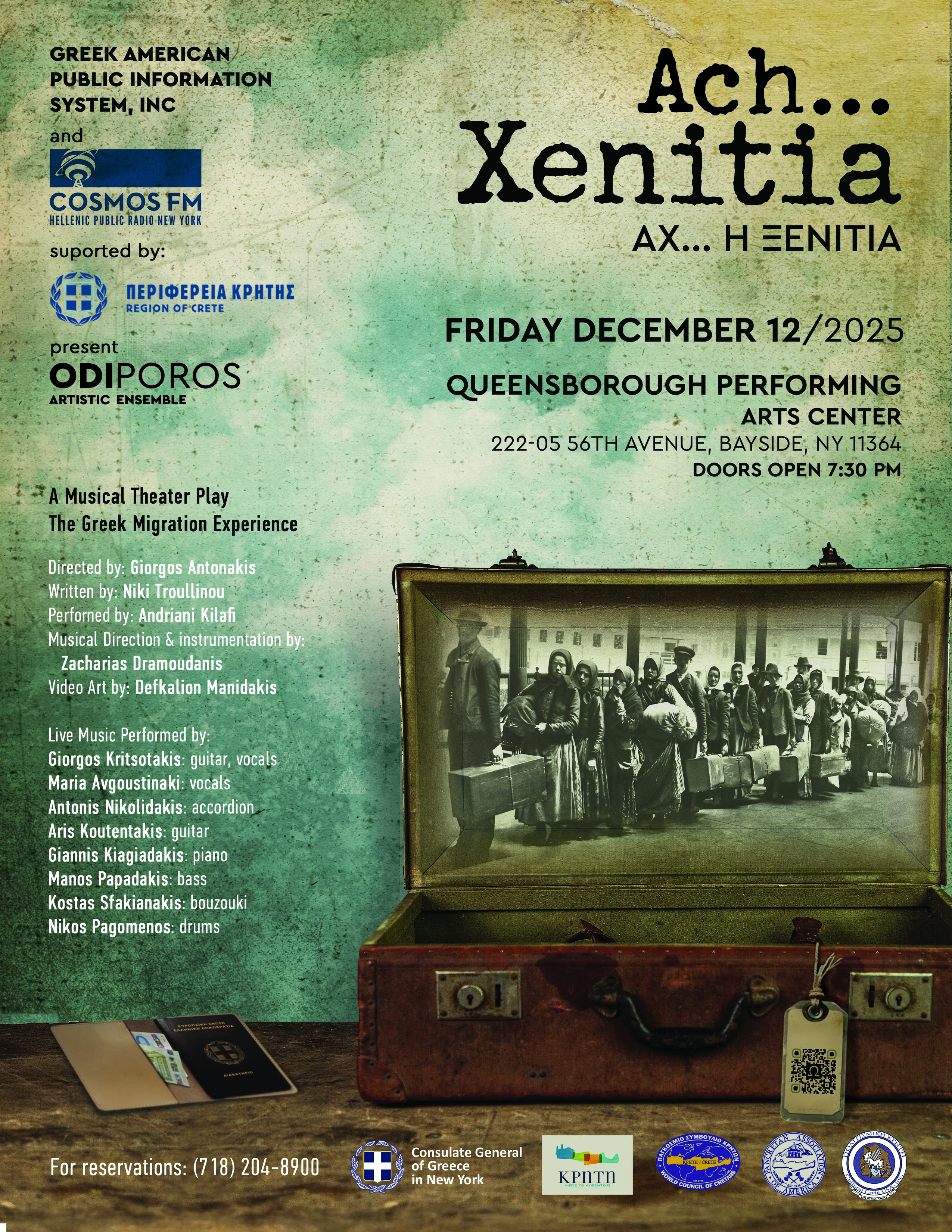 Το Ελληνικό κοινωφελές ραδιόφωνο της Νέας Υόρκης – COSMOS FM και ο Εκπαιδευτικός Οργανισμός G.A.E.P.I.S., σε συνεργασία με την Περιφέρεια Κρήτης, παρουσιάζουν το θεατρικό μουσικό σχήμα ΩΔΗπόρος (ODIPOROS) στην παράσταση «Αχ, η Ξενιτιά» – “ACH Xenitia”.